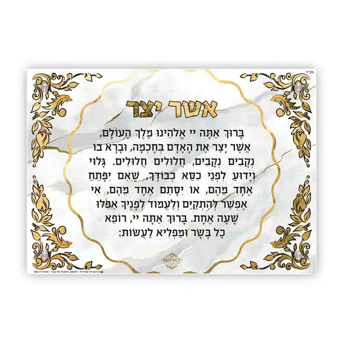 ברכת אשר יצר בהדפסה על זכוכית מחוסמת בעובי 6 מ"מ ומגיע עם ערכה של ברגים וספייסרים לתליה.