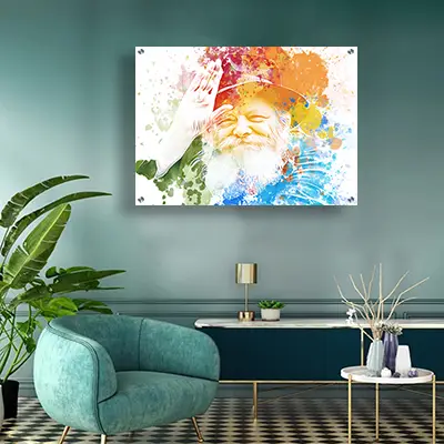 587 – ציור פופ ארט צבעוני של הרבי מליובאוויטש מחייך על זכוכית או קנבס