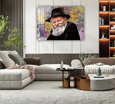 696 – ציור מודרני וצבעוני של הרבי מליובאוויטש מחייך על קנבס או זכוכית